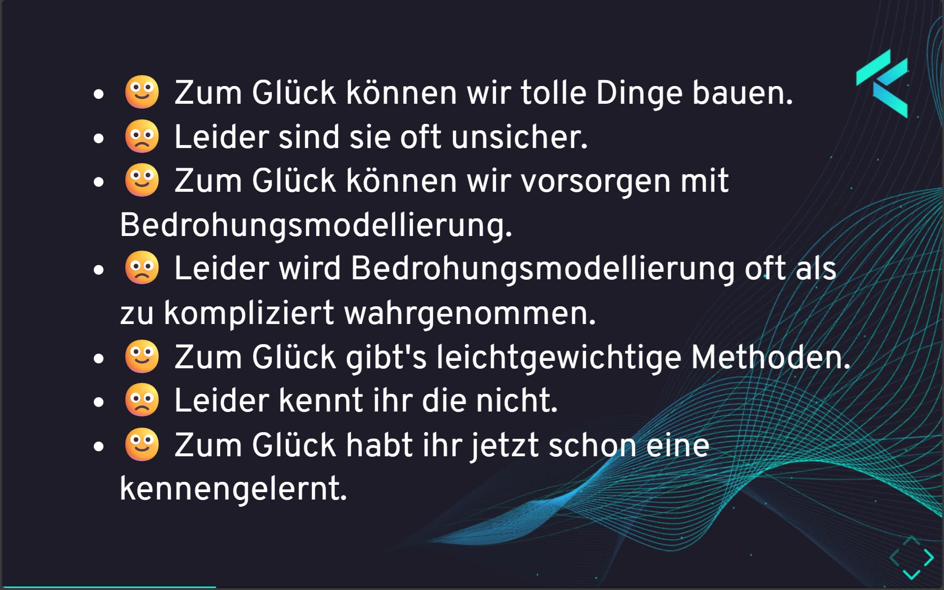 Bei der Methode wechseln sich “Leider …” und “Zum Glück …”- Sätze ab. Wer so die Sicherheit eines Systems diskutiert, wendet eine Threat Modeling Methode an. Das aufgeschriebene Gespräch ist ein Threat Model.