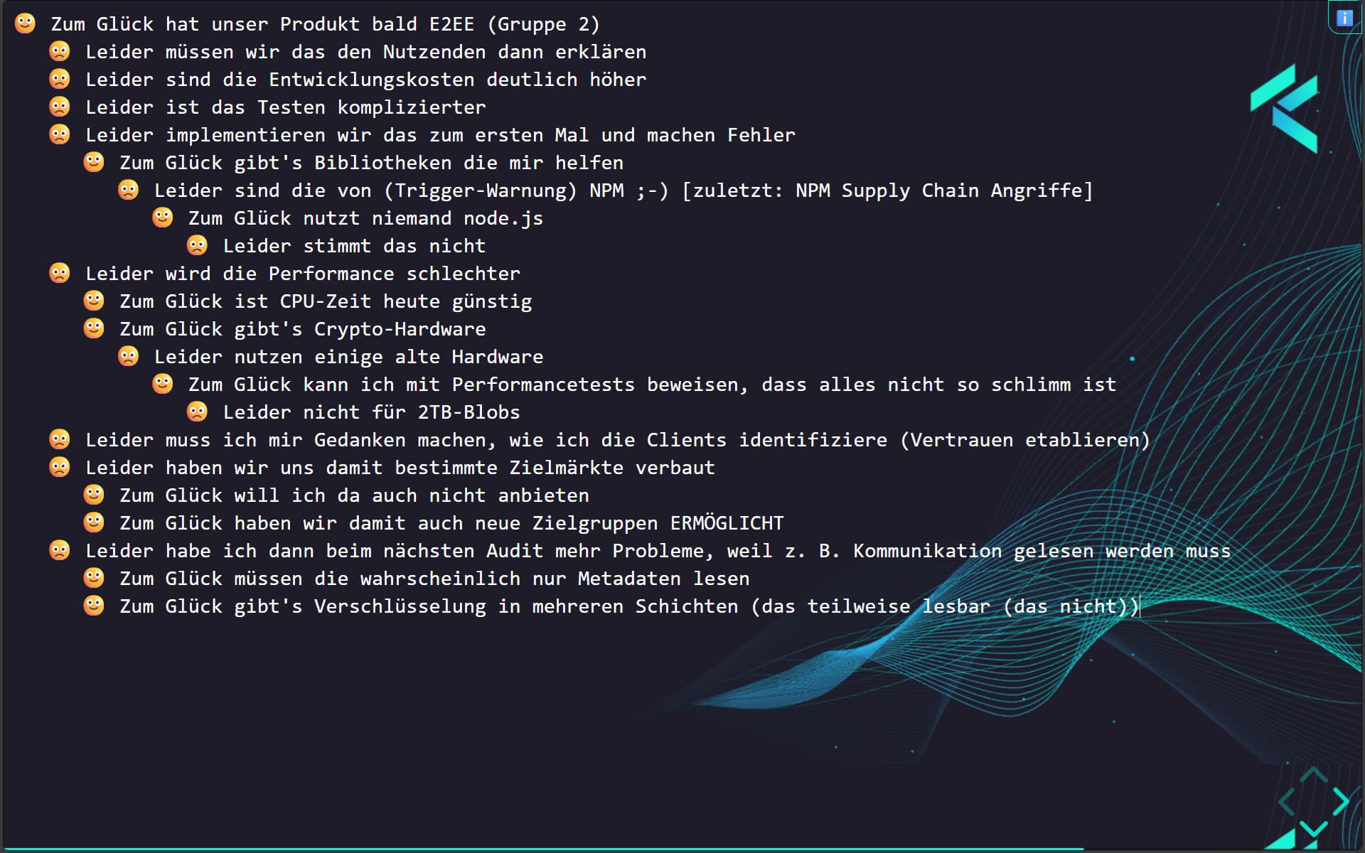 Teilnehmende sahen einen Bildschirm wie diesen - Ihr seht die letzte Sammlung zur Eröffnung “ Zum Glück hat unser Produkt bald E2EE”: